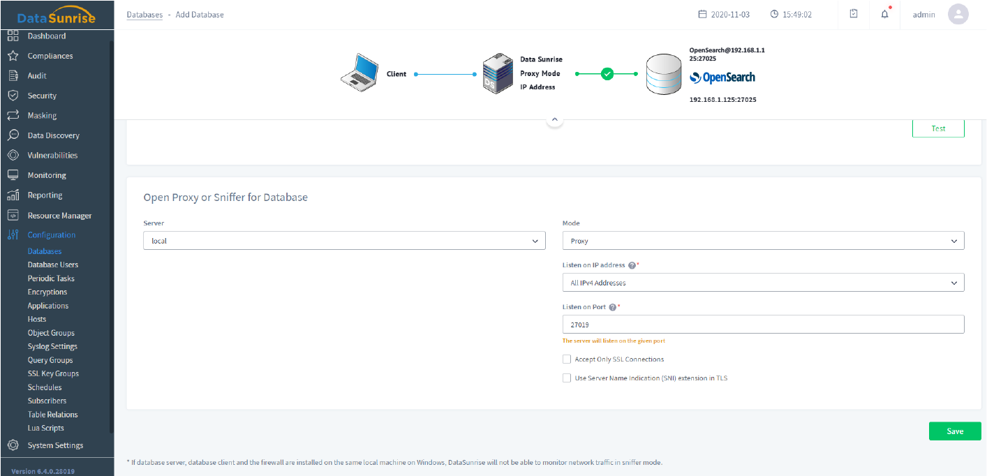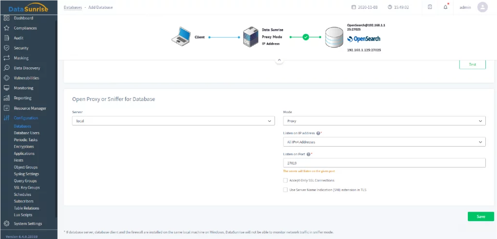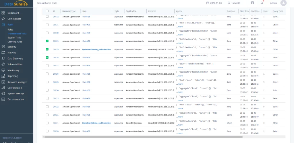 This features enables you to get auditing results collected by Amazon OpenSearch native audit tools. It can be used on Amazon OpenSearch database because DataSunrise doesn’t support sniffing on RDS database