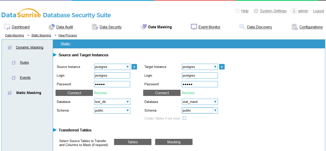First, to employ static masking you need to create an empty copy of the target database. Then open DataSunrise Web Console, Static Data Masking subsection.
