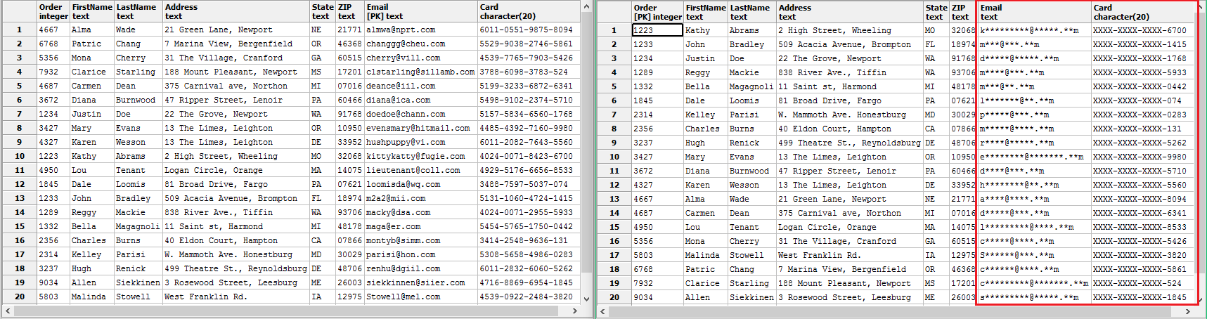 Selecting columns to be masked and masking types. Having it done, specify a table which should be transferred to a new database, and masking algorithms to apply (“Card” and “Email” columns here). Then you can start the masking process and compare original and masked data. Original: