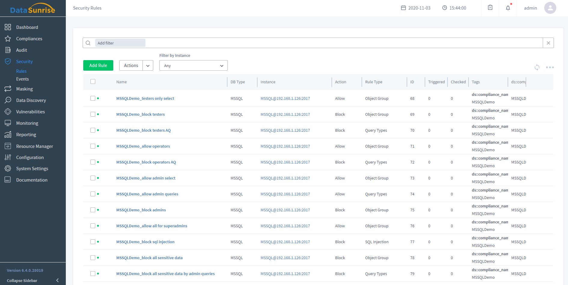 - DataSunrise Datenbank-Aktivitätsüberwachung ermöglicht die Echtzeit-Verfolgung von Benutzeraktionen und Änderungen an Datenbanken, um eine konformitätsbereite Umgebung sicherzustellen und die Sichtbarkeit der Aktivitäten über mehrere Datensilos hinweg zu erhöhen. DataSunrise kann nicht nur die Aktivitäten von Datenbankbenutzern, sondern auch von Anwendungsbenutzern überwachen, wenn Anwendungen (wie SAP, Salesforce, Siebel, Workday oder andere) mit einem einzelnen Datenbankbenutzer mit der Datenbank verbunden sind. Die umfassende Schnittstelle und flexible Regeln erleichtern die Definition von Überwachungsrichtlinien für einzelne Datenbankobjekte.