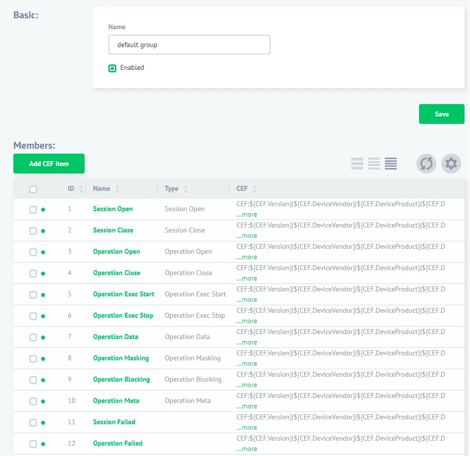 Dann navigieren Sie zu “Konfigurationen” -> “Syslog-Einstellungen” und erstellen Sie bei Bedarf eine neue CEF-Gruppe oder nutzen Sie die “Standardgruppe”. Fügen Sie die Ereignisse, die Sie an Syslog weiterleiten wollen, der Gruppe hinzu.