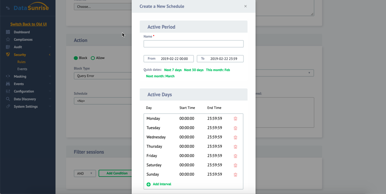 Auf diese Weise können Sie diese zusätzliche Sicherheitsschicht nutzen, um die Zeit- und Zugriffsumfänge der Datenbankinhalte zu steuern und die Exposition auf ein minimales Niveau zu reduzieren, indem Sie diese Sicherheitsschichten von DataSunrise einbeziehen, um alle potenziellen Gründe für Datenlecks zu verschärfen.