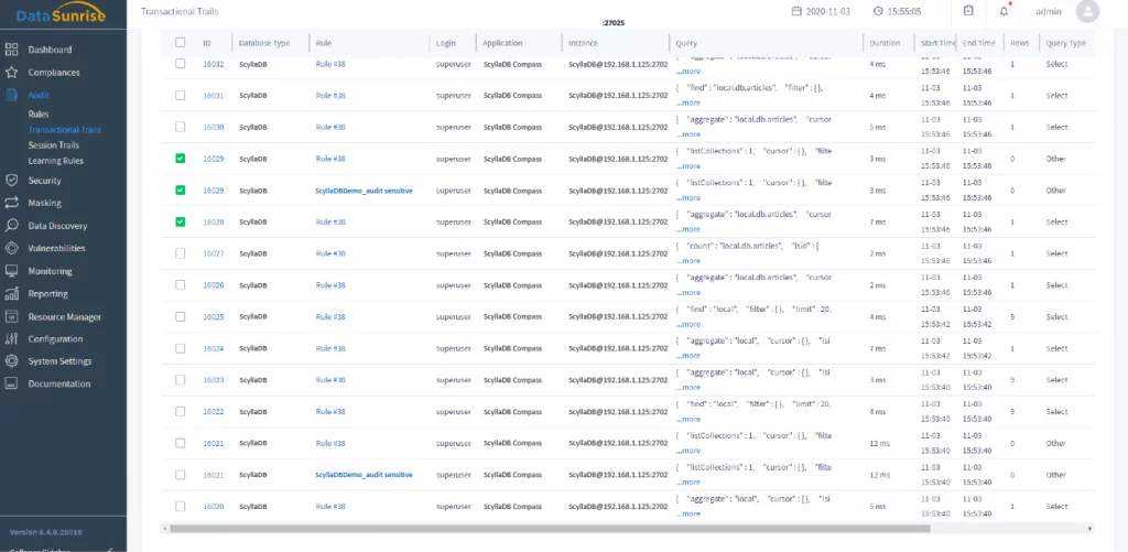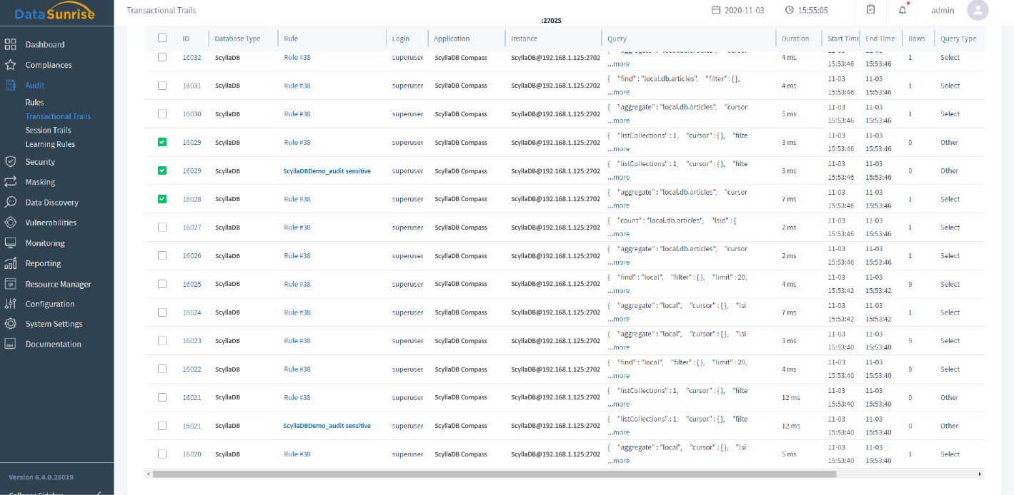 Diese Funktion ermöglicht es Ihnen, Prüfergebnisse zu erhalten, die von Scylla Native Audit Tools gesammelt wurden. Es kann auf der Scylla-Datenbank verwendet werden, da DataSunrise kein Sniffing auf der RDS-Datenbank unterstützt