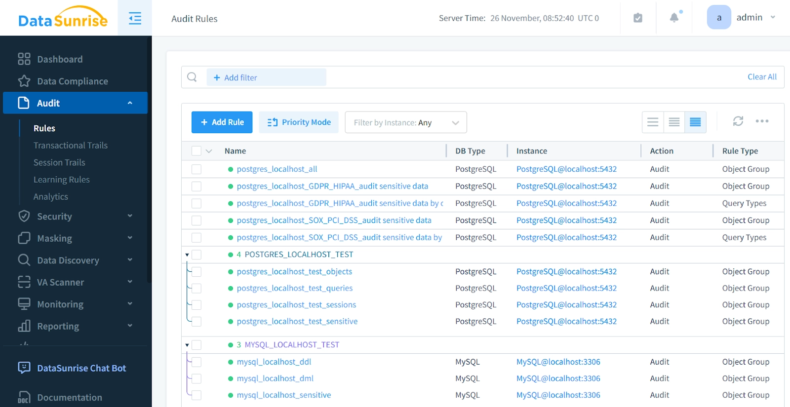 DataSunrise sobresale precisamente aquí, ofreciendo características avanzadas de auditoría de manera predeterminada que son fáciles de gestionar y están optimizadas para el rendimiento. Desde notificaciones en tiempo real sobre actividades sospechosas hasta informes automatizados de cumplimiento y seguimiento integral de eventos y sesiones, DataSunrise mejora la auditoría de bases de datos para cumplir con las demandas del entorno regulatorio exigente de hoy en día.