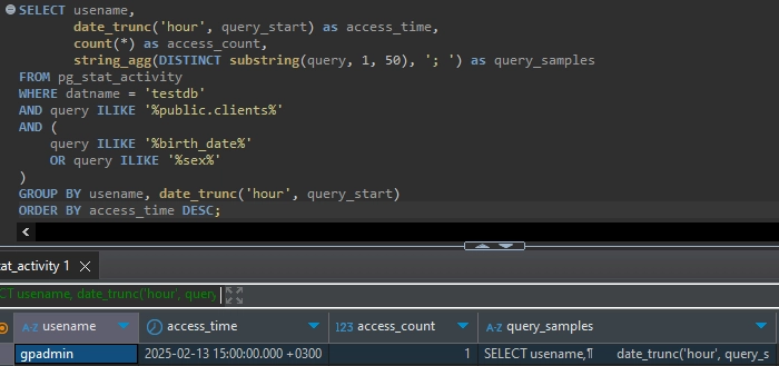 -- Configurar registro de auditoría integral ALTER SYSTEM SET logging_collector = on; ALTER SYSTEM SET log_destination = 'csvlog'; ALTER SYSTEM SET log_statement = 'all'; ALTER SYSTEM SET log_min_duration_statement = 1000; ALTER SYSTEM SET log_connections = on; ALTER SYSTEM SET log_disconnections = on; ALTER SYSTEM SET log_error_verbosity = 'verbose';