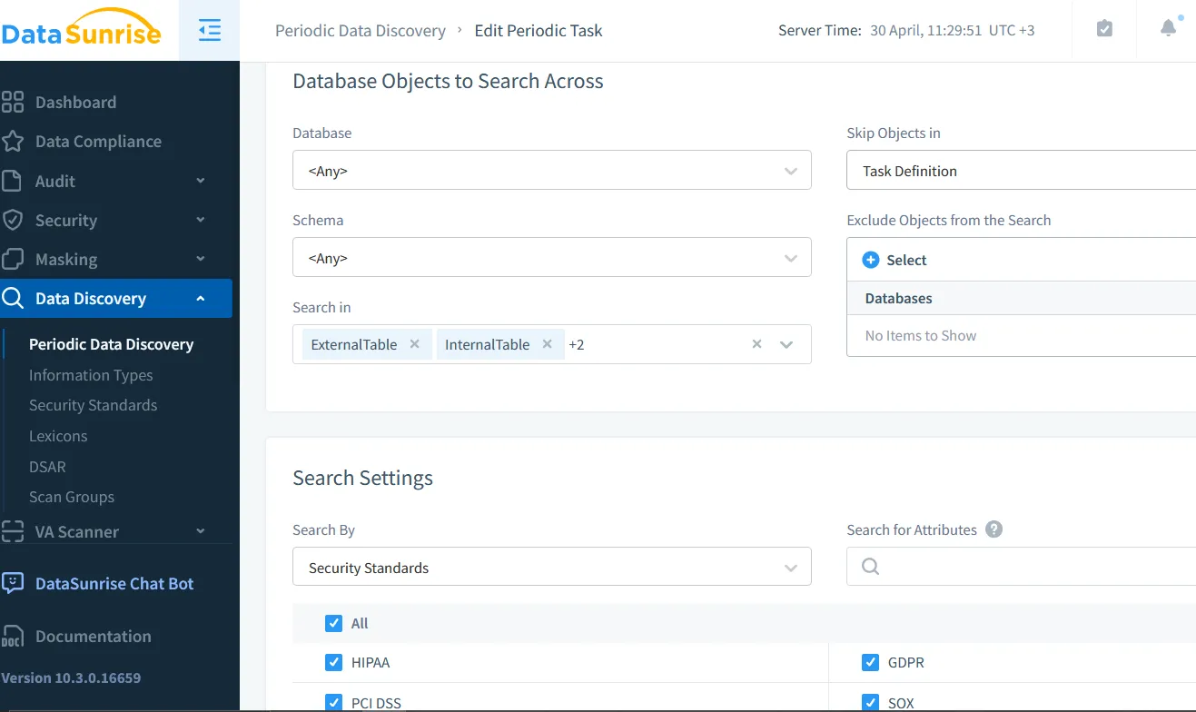 DataSunrise actúa como un Gestor de Cumplimiento con marcos integrados para SOX, GDPR, HIPAA. Soporta automatización de políticas sin código y generación personalizada de evidencia de cumplimiento, ayudando a eliminar brechas y reducir la supervisión manual.