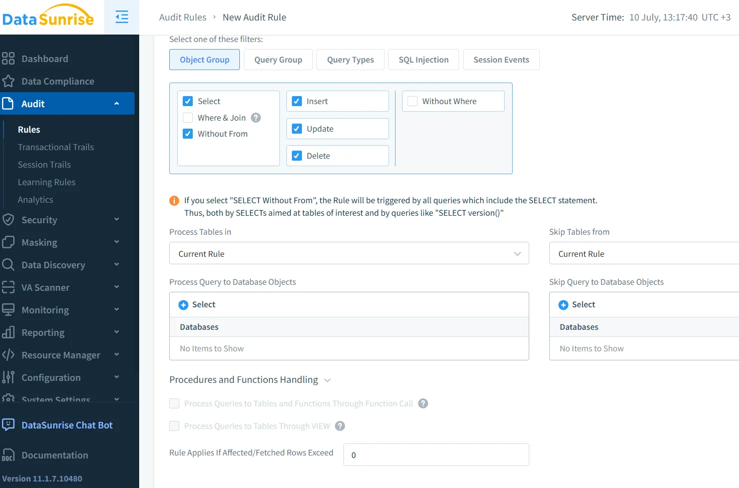 Mientras que el registro nativo ofrece una capa básica de trazabilidad, DataSunrise lo amplía con políticas de auditoría inteligentes, análisis de comportamiento en tiempo real y funciones de enmascaramiento dinámico. Opera a través de un proxy inverso para inspeccionar el tráfico SQL y permite una auditoría granular basada en reglas. Puedes registrar la actividad asociada a roles de usuario, tablas específicas o incluso el contenido de las consultas.