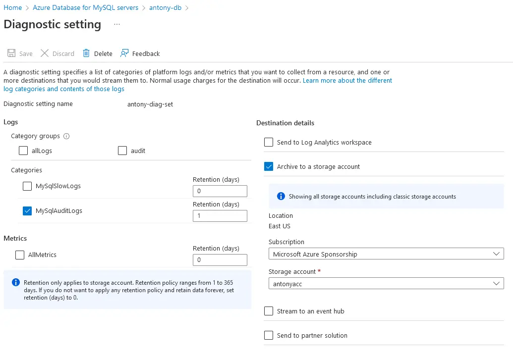 Marque MySqlAuditLogs y Archivar en una cuenta de almacenamiento y seleccione su Cuenta de Almacenamiento: