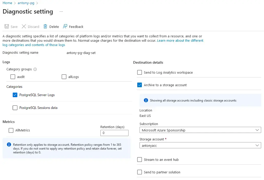 Marque tanto Registro del servidor PostgreSQL como Datos de sesiones de PostgreSQL. Luego, marque Archivar en una cuenta de almacenamiento y seleccione su cuenta de almacenamiento