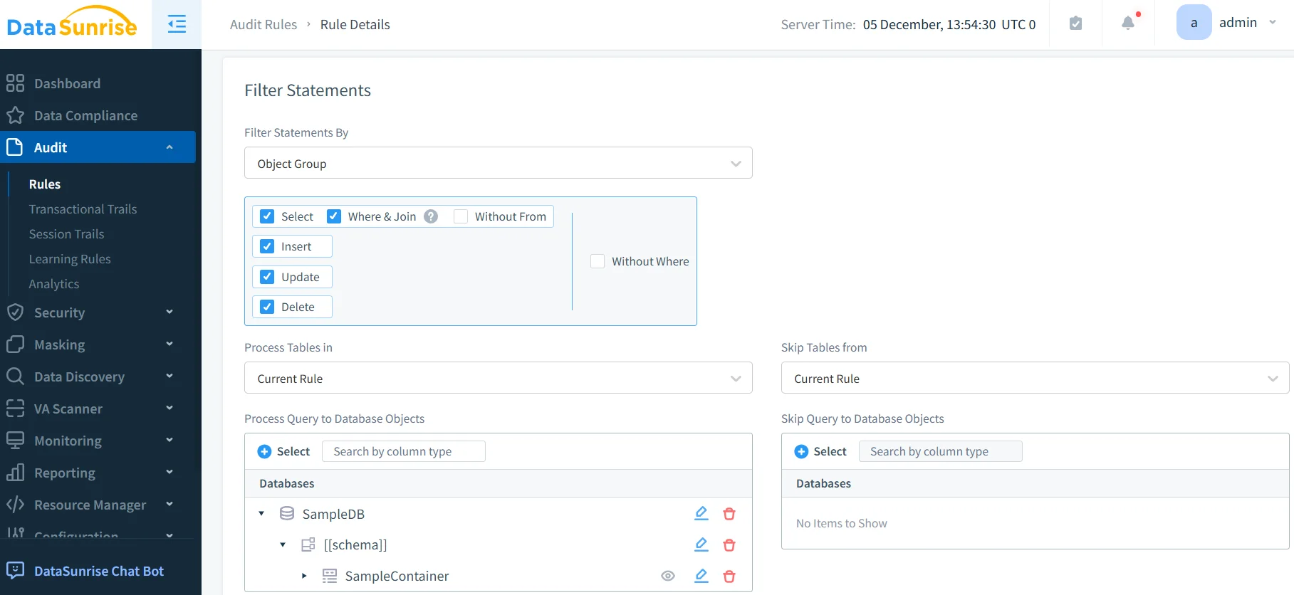 - Déployez DataSunrise pour une surveillance avancée allant au-delà des capacités natives