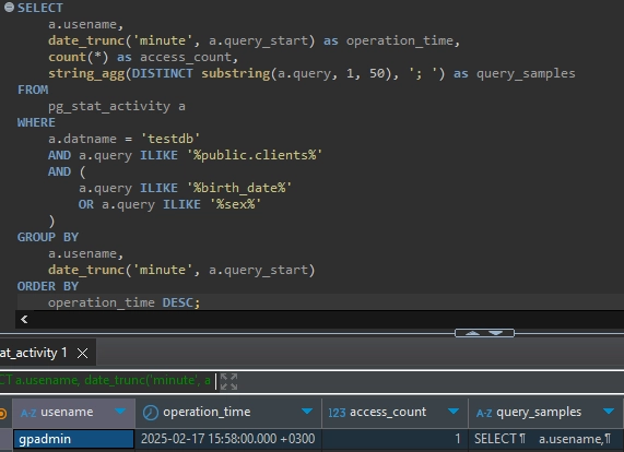 -- Interroger les activités liées à la conformité SELECT username, database_name, event_time FROM gp_toolkit.gp_log_system WHERE event_severity = 'LOG' AND event_time >= current_timestamp - interval '7 days';
