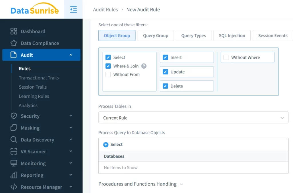 Création d’une règle d’audit avec des filtres avancés dans DataSunrise Mettre en place une surveillance en temps réel