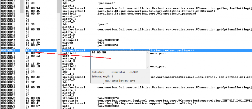 Un appel de méthode getShort se produit à la position 0000004E, ce qui signifie que B6 est un code opération de l’instruction, et 003C est une étiquette d’opérande. Il est nécessaire de changer une instruction pour appeler getInt pour un objet Variant.