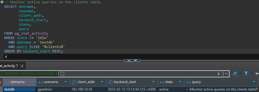 Il sistema di logging di Greenplum acquisisce informazioni dettagliate sulle attività del database, essenziali per il monitoraggio delle attività del database. La seguente configurazione abilita il tracciamento dettagliato delle istruzioni SQL, delle connessioni e delle disconnessioni su tutti i segmenti: