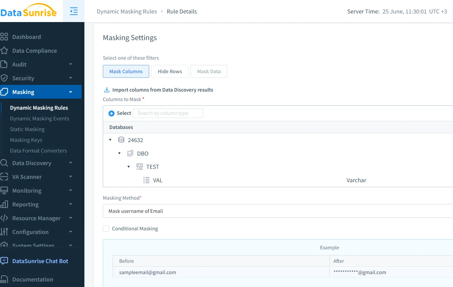 are delivered with masked values to both the agent and stored logs. DataSunrise supports dynamic masking that works across cloud databases and integrates with LLM-based pipelines.