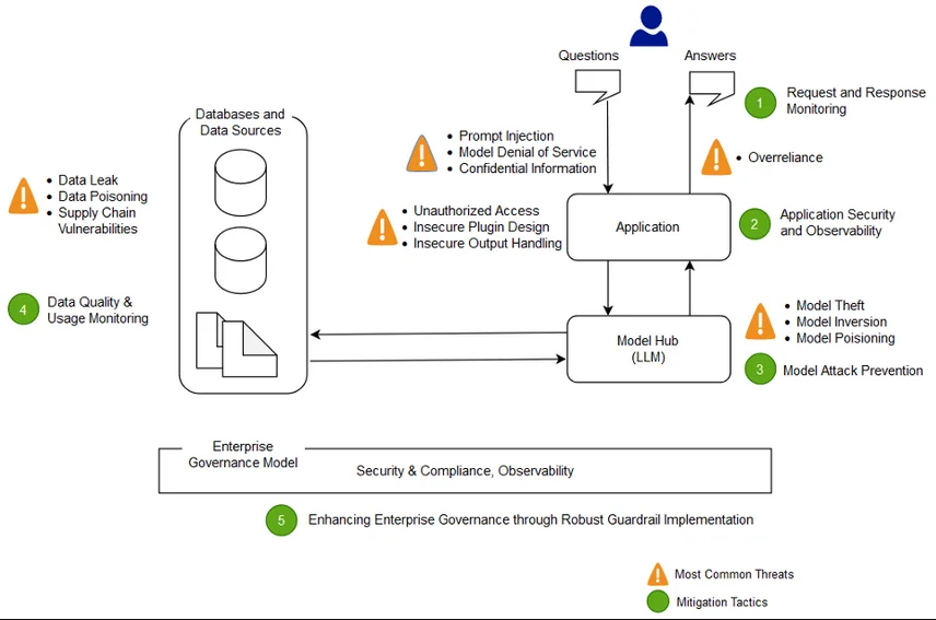 OWASP’s initiative around LLMs offers a structured approach to identifying and mitigating vulnerabilities specific to GenAI systems. Some key threats include prompt injection, model denial-of-service, sensitive data leakage, and insecure plugin use.