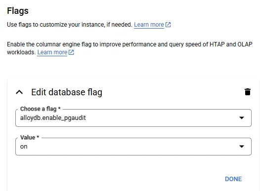 - Enable Audit Flags – In the Google Cloud console navigate to AlloyDB Clusters ➜ Configuration ➜ Flags and set
