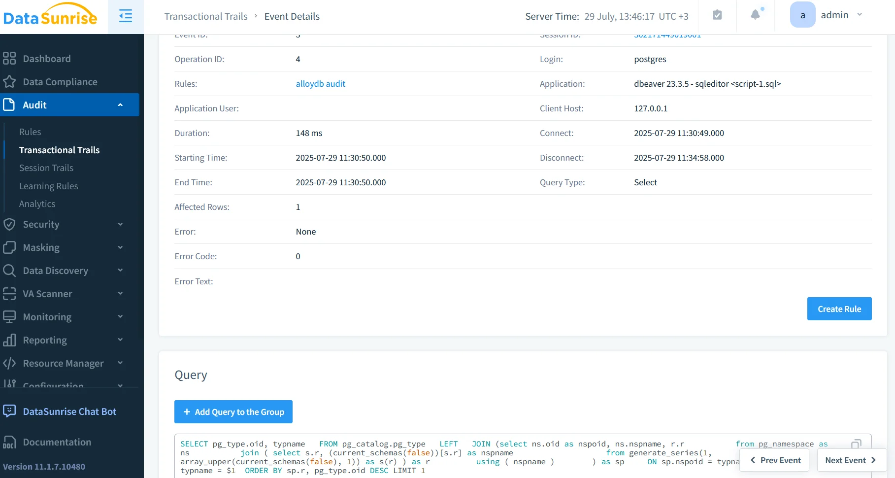 A single breach can erode customer trust faster than any marketing campaign can build it. Database Activity Monitoring adds behavioural analytics, alerting when sessions deviate from trained norms. Tightly linked audit trails simplify attestations for GDPR, HIPAA, PCI-DSS and friends, as detailed in DataSunrise’s write-up on compliance regulations. Advanced threat detection, role-based controls and encrypted storage — all integral to AlloyDB — provide the bedrock on which the audit trail stands.