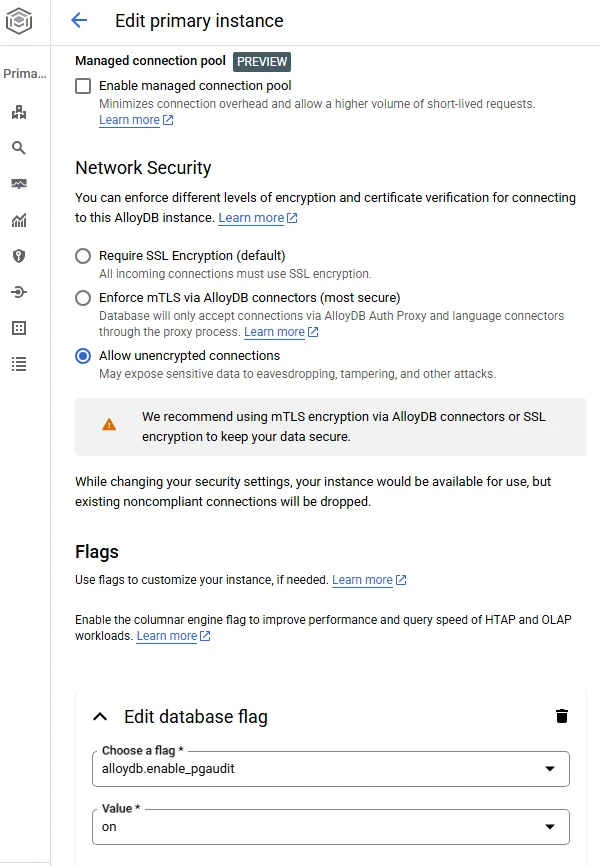 --database-flags=alloydb.enable_pgaudit=on,pgaudit.log='all'