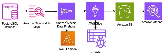 End-to-end architecture diagram showing PostgreSQL instance streaming logs through CloudWatch, Kinesis, and AWS Glue to Amazon S3 for Athena analysis