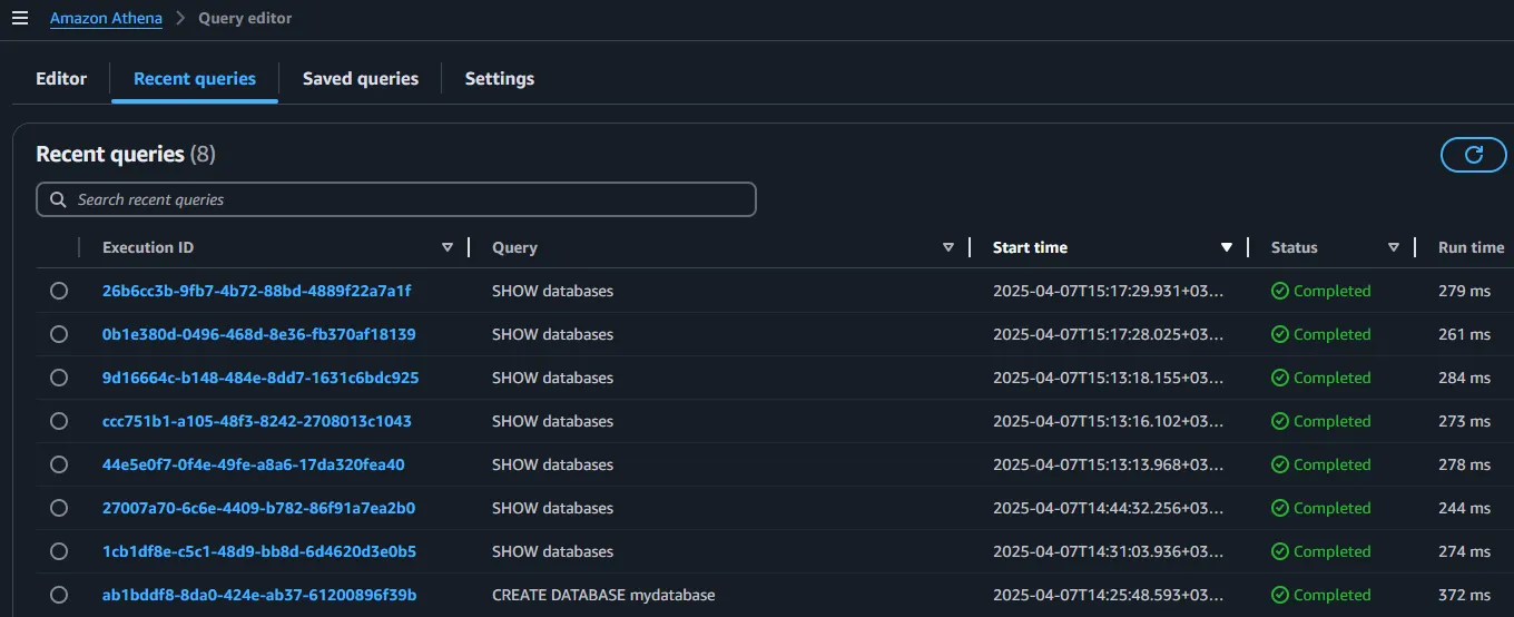 Viewing recent SQL query history executed in Amazon Athena with timestamps, execution IDs, and statuses