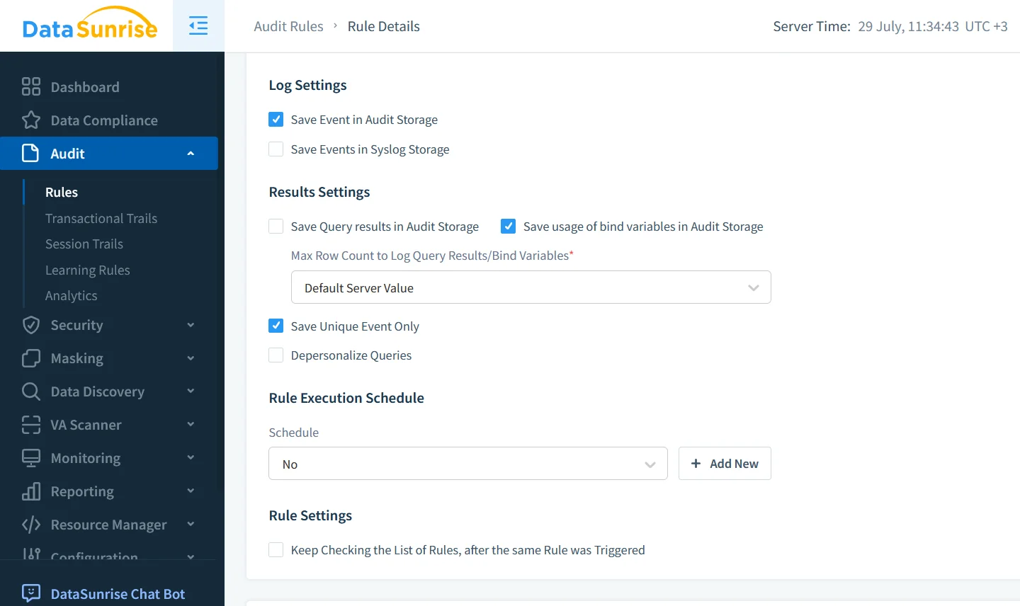 Volume and velocity turn audits into big data problems. DataSunrise augments raw events with Behavior Analytics. A profile is learned for each account—typical hours, tables, and command types. Deviations trigger policy‑driven counter‑measures defined in the graphical Audit Rules builder. Security teams no longer chase false positives; they focus on material anomalies such as a retired payroll account suddenly exporting millions of rows at 3 a.m.