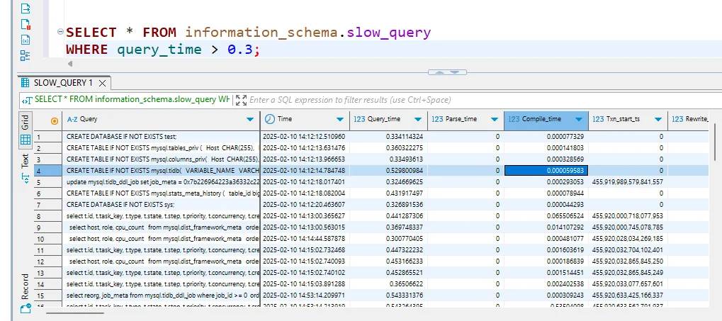 Once enabled, you can review slow queries in the information_schema.slow_query table. This helps pinpoint inefficient queries that may need indexing or optimization: