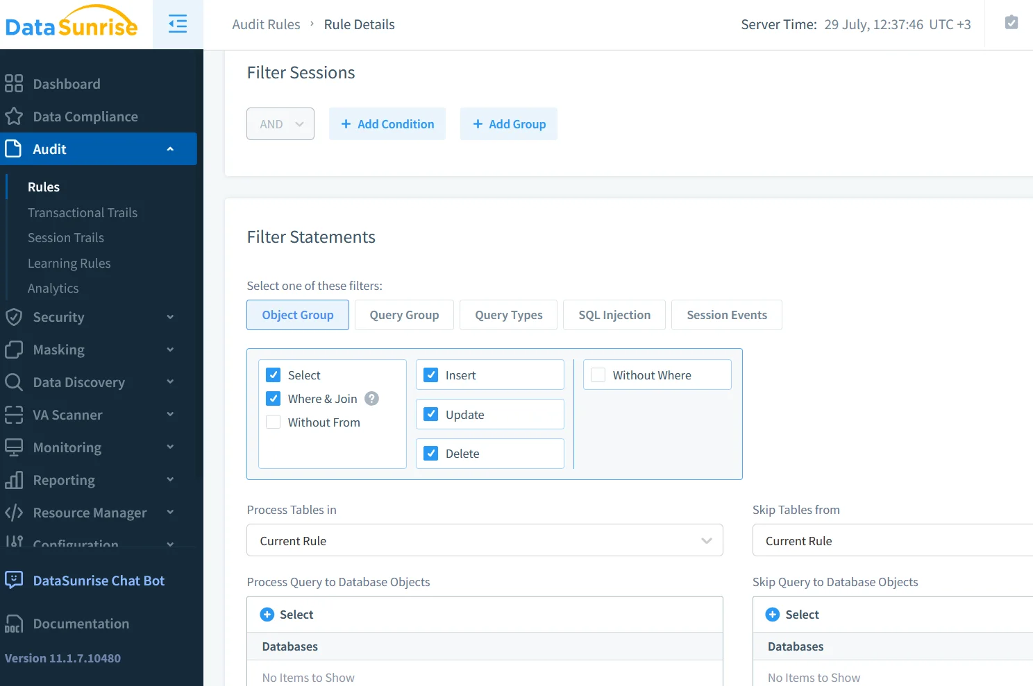 Even with native logs, teams often need more context—SQL text rewrites, risk scoring, or cross‑database correlation. Data Audit from DataSunrise introduces a transparent proxy that understands AlloyDB’s PostgreSQL dialect and can enrich each event with: