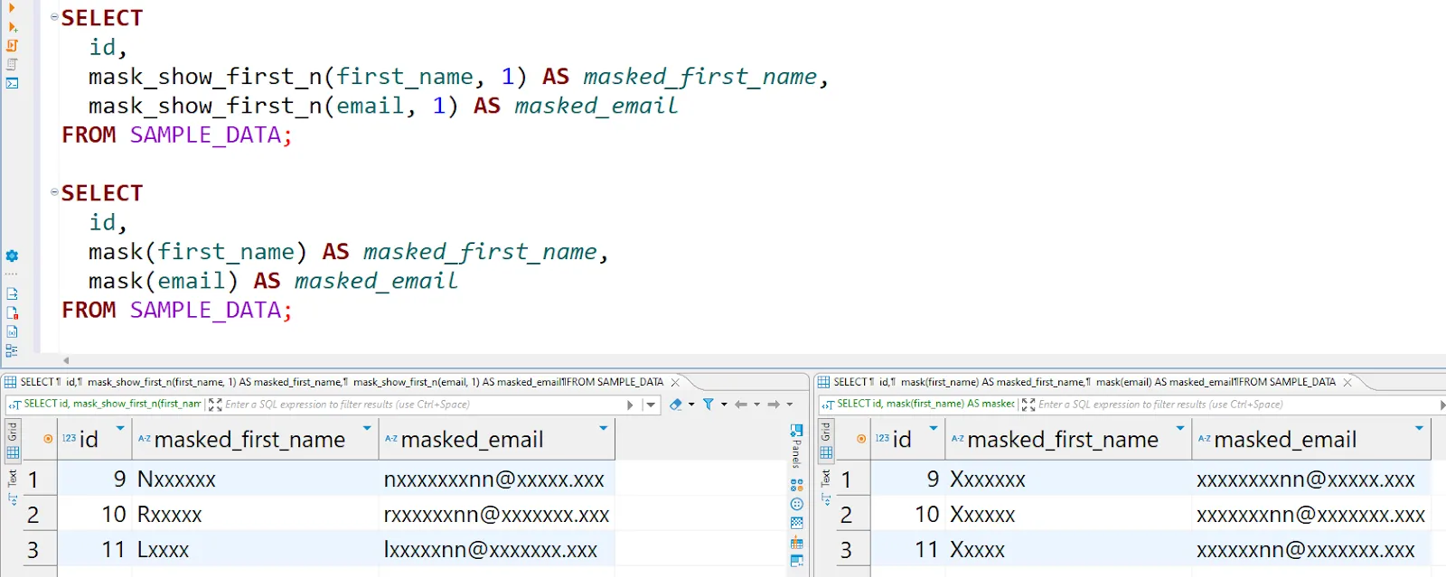 Limited Customization: Masking functions follow predefined patterns, and more advanced masking—like conditional or role-based transformations—requires custom UDFs or external tools.