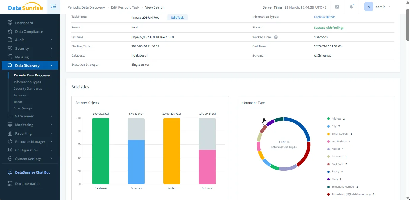 Complementing this capability, DataSunrise's AI-powered Sensitive Data Discovery scans Impala databases to automatically find, classify, and secure regulated data. Using advanced natural language processing and pattern recognition, the system identifies: