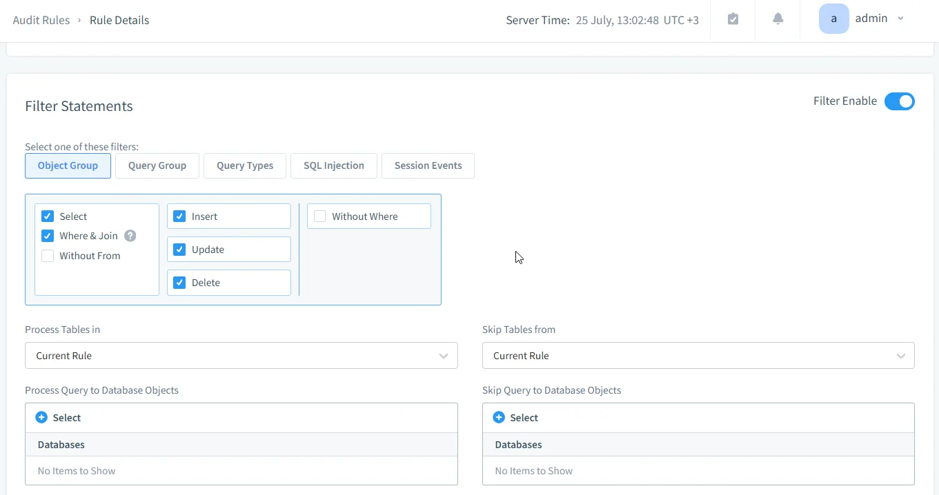SELECT,UPDATE), and other filters if necessary, and click Save to apply the changes to the rule