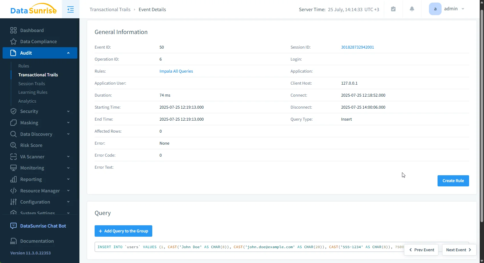 DataSunrise will be now tracking every matching event for you to monitor and analyze the detailed information on each event