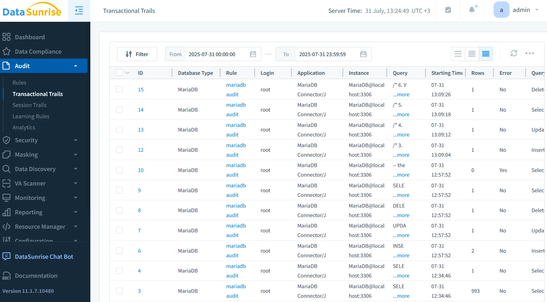 - Unified audit trail: MariaDB events are merged with PostgreSQL, Snowflake or MongoDB in the DataSunrise audit log, enabling central analytics.