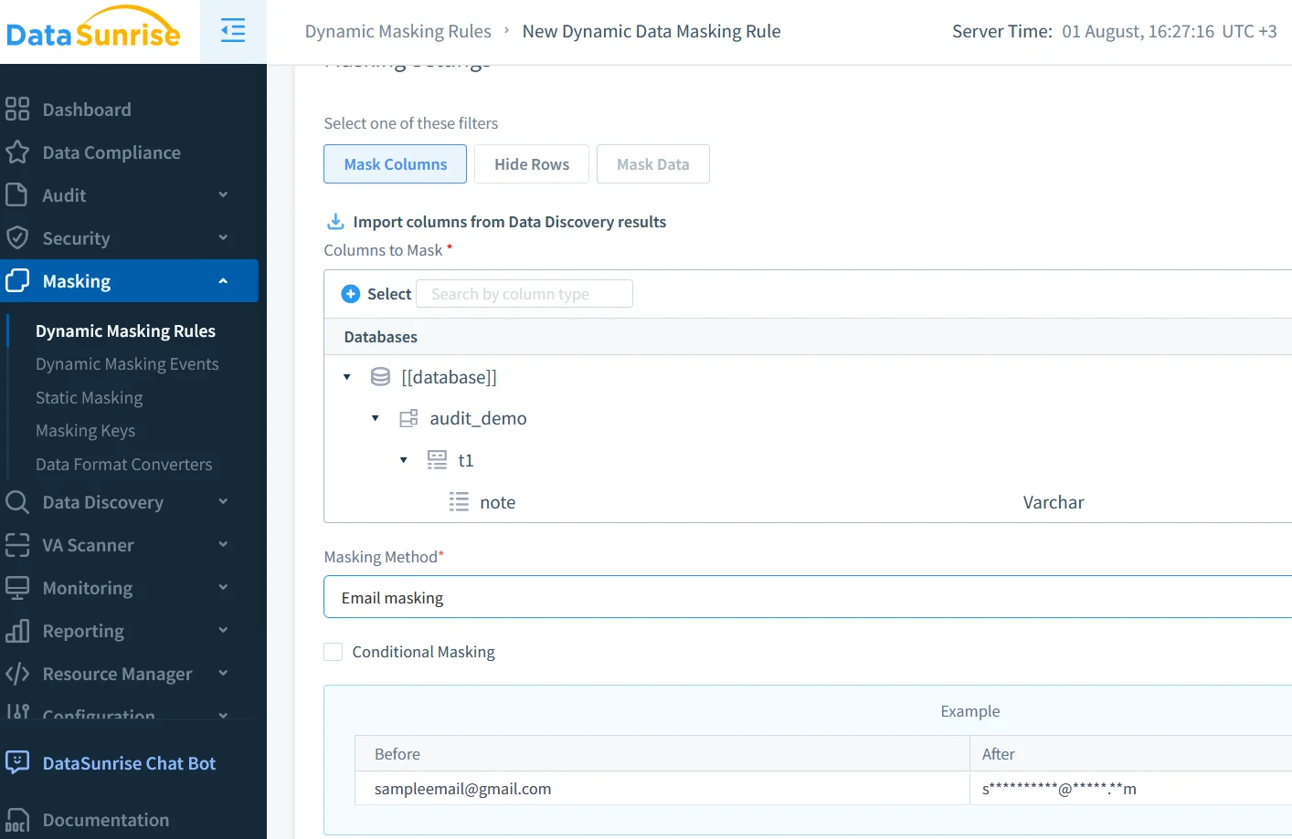 Security is not only about who accessed the database but what they saw. Pipe the same real‑time feed through DataSunrise’s dynamic data masking engine. The proxy replaces credit‑card numbers with format‑preserving tokens whenever a session lacks the “PCI-Access” role. Column‑level sensitivity labels come from nightly crawls powered by DataSunrise data discovery; if a developer deploys a table called insurance_claims at 02:00, it is tagged as “PHI” by 03:05 and masked on the next query.