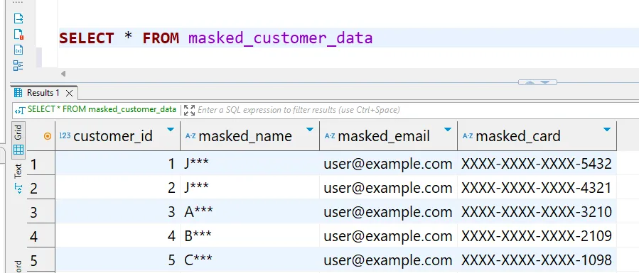 These masking techniques provide a solid foundation for protecting sensitive data in development and testing environments while maintaining the data's utility for non-production use cases. The masked copies retain the original data structure and relationships, making them suitable for application testing and development work.