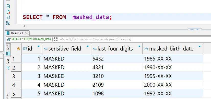 For more complex masking requirements, you can create protected static copies using views. This approach is particularly useful when you need different levels of data masking for different types of sensitive information: