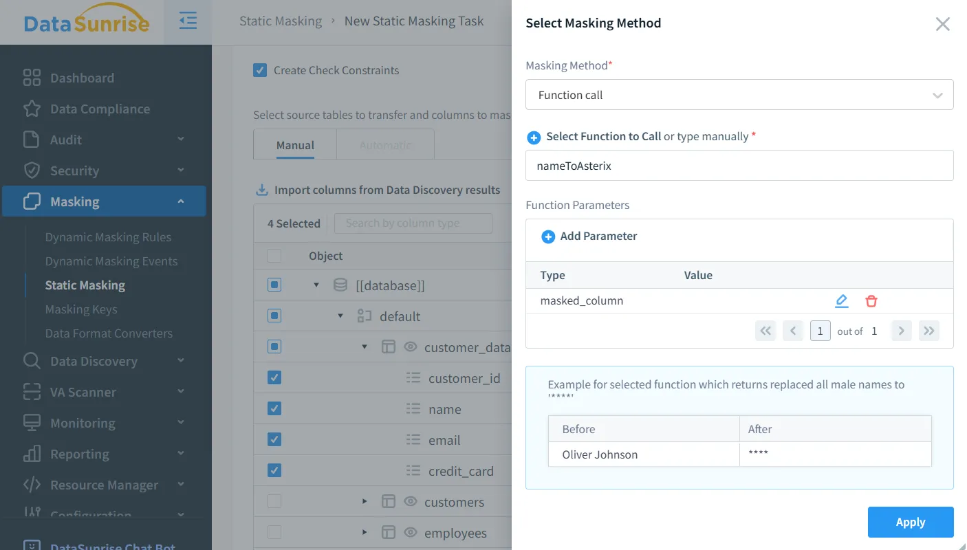 Static data masking for Apache Hive and other databases in DataSunrise features: