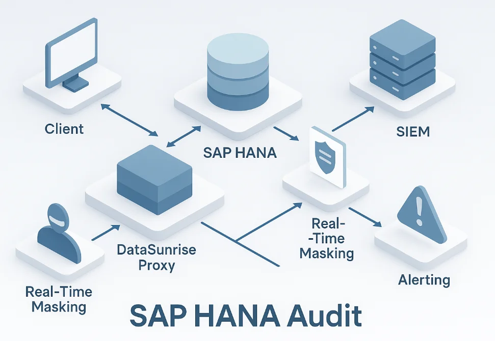 DataSunrise places a reverse proxy in front of HANA, records every request—success or error—and stores enriched events centrally. A single rule can span dozens of HANA hosts, capture bind values, and invoke context‑aware policies.
