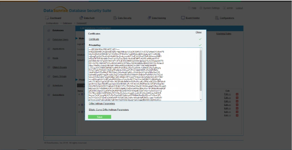 The final step is to install the key into DataSunrise. To do this, we open the Configurations tab, select the required database, open Certificates window, PrivateKey tab and paste the private key copied from the file.