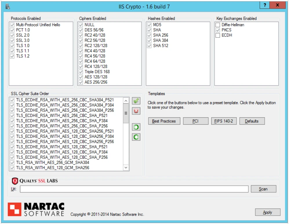 <>The server is configured and its private key is got, but it still uses ephemeral algorithms because of the cryptoprovider. To disable the ephemeral key exchange algorithms it is necessary to refer to the corresponding Microsoft guide or its GUI interpretation — IIScrypto.